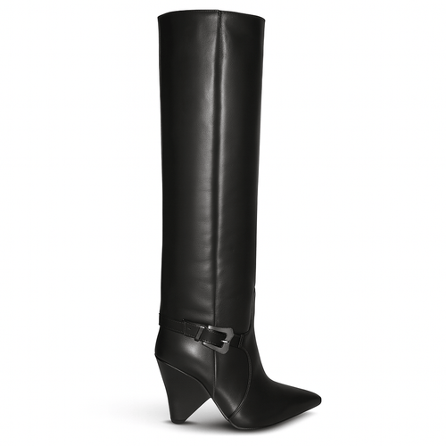 Schlauchstiefel mit spitzer Spitze aus echtem Leder, mit Riemen und Schnalle, mittelhoher Kegelabsatz von 90mm
