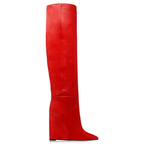 Tubular boot below the knee in genuine leather with 100mm wedge