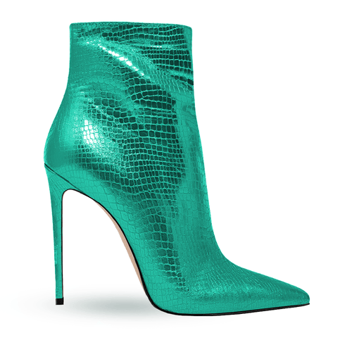Pointed-toe ankle boot in snake-effect laminated leather with side zip and 100mm or 120mm stiletto heel