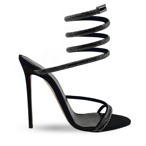 Round toe sandal in suede with crystal spiral that twists around the ankle and double front band, 100mm or 120mm stiletto heel