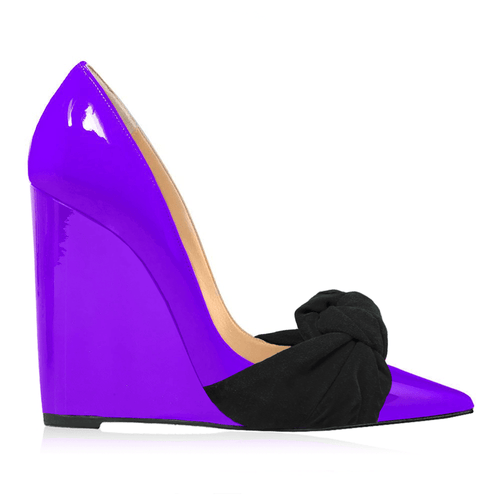 Pointed toe décolleté in patent leather with bow in genuine suede, 100mm wedge