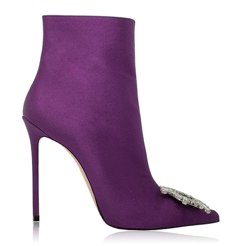 Botín de raso puntiagudo con cremallera interna, accesorio y tacón stiletto de 120mm