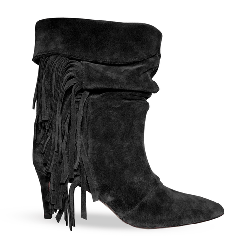 Bottine à bout effilé en véritable daim avec revers, franges et talon aiguille de 60 mm
