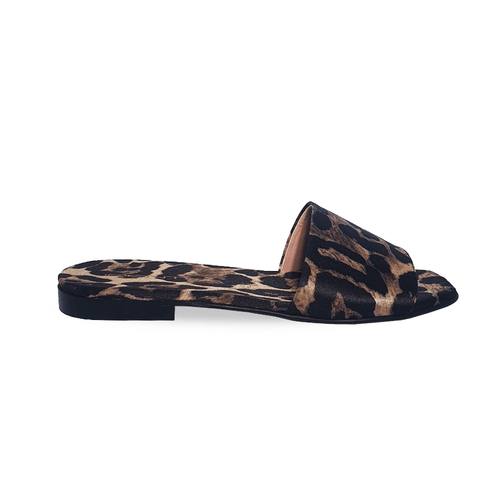 Sandalo flat con fascia anteriore, suola in gomma e tomaia in tessuto animalier.